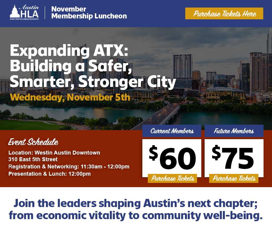 Our goal is to keep our members up-to-date on local business trends, co-operatives, marketing opportunities and regulatory and legislative changes that could impact the way you do business. Being a member of Austin Hotel & Lodging Association you will help influence and improve the hotel and lodging industry in Austin and surrounding areas as well as having the opportunity to network with other industry professionals and leaders.